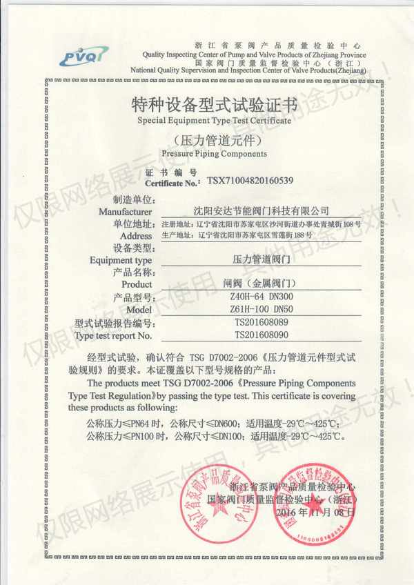 安達閥門特種設(shè)備實驗證書